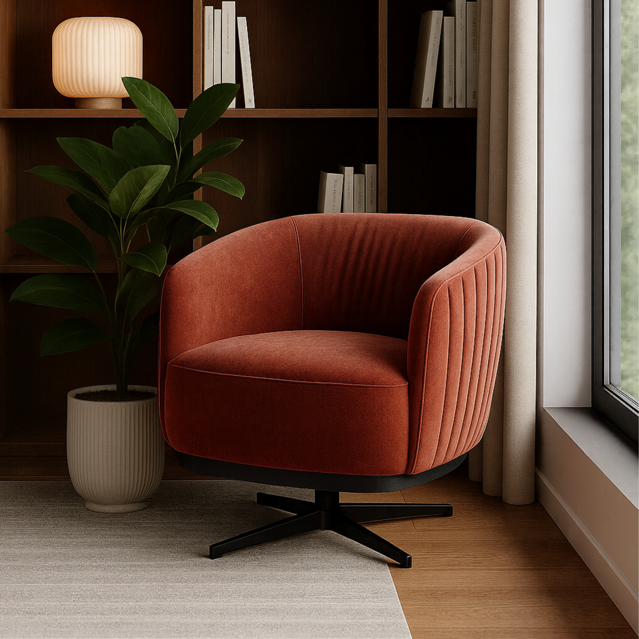 A distinctive feature is the subtle vertical stitching on the inner backrest, adding textural depth and unique character. The chair stands on four sleek, tapered black metal legs, which provide both stability and a lightweight appearance.